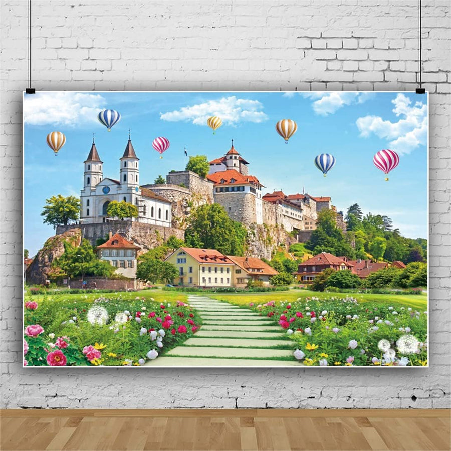 Renaiss 3x2.5m Schloss Fotografie Kulisse Verträumter Garten Blume Blauer Himmel Heissluftballon Hin