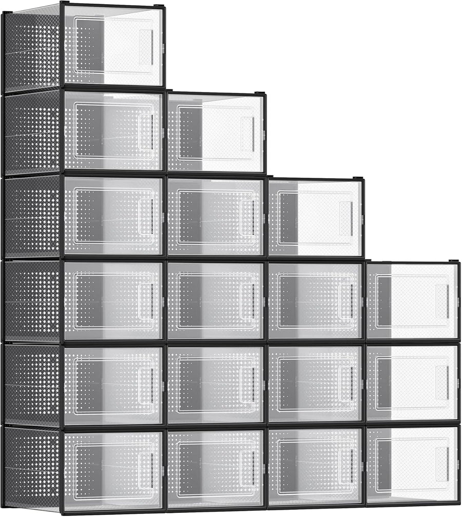 SONGMICS Schuhboxen, 18er Set Schuhkartons durchsichtig, faltbar und stapelbar, bis Grösse 44, trans