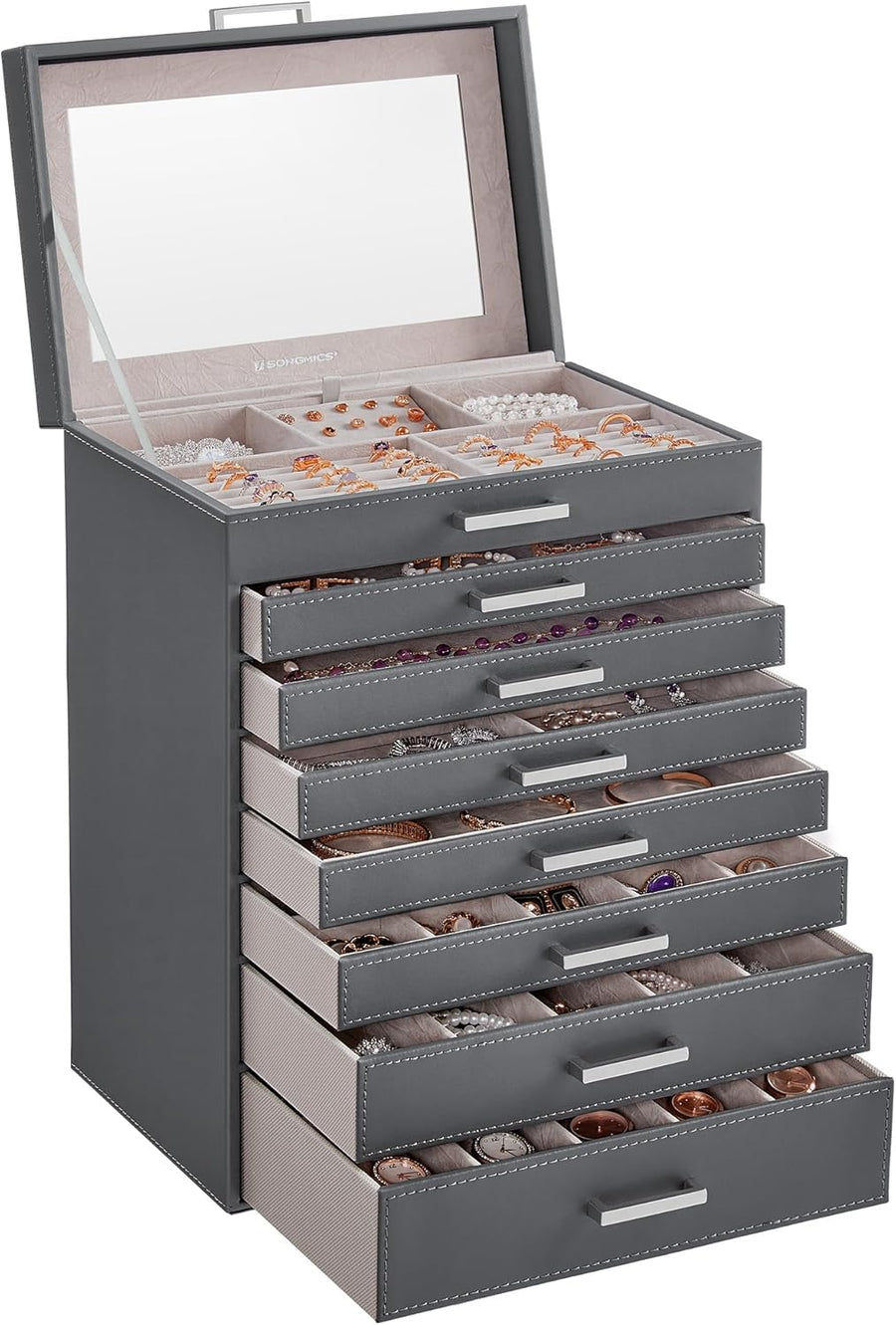 SONGMICS Schmuckkästchen 8 Ebenen, Schmuckkasten mit grossem Spiegel, Schmuckschatulle, 7 Schubladen