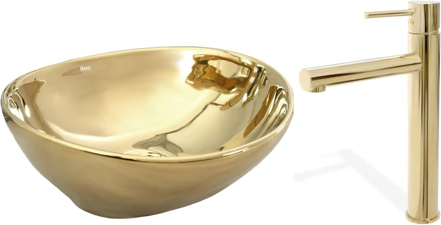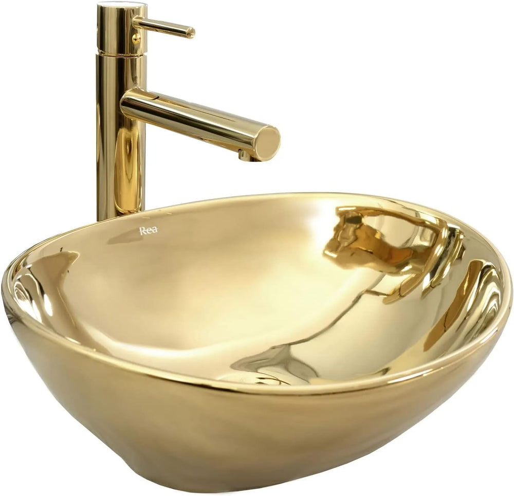 VBChome Waschbecken Gold + Armatur 41 x 35 x 15 cm Kleine Keramik Oval Waschtisch Handwaschbecken Au