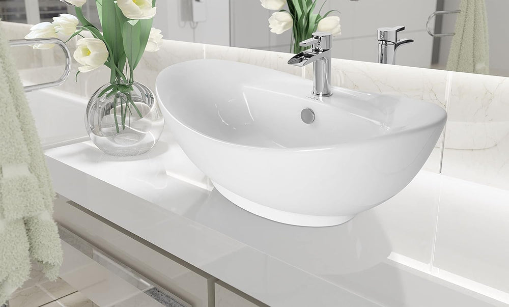 VBChome Waschbecken 59 x 39 cm mit Hahnloch Keramik Weiss Oval Waschtisch Handwaschbecken Aufsatzwas