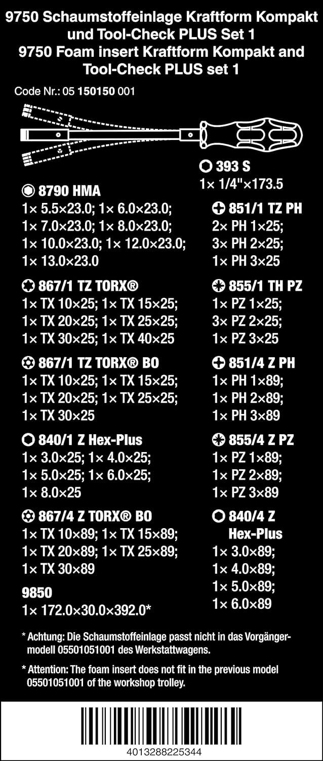 Wera 05150150001 9750 Schaumstoffeinlage, Kraftform Kompakt und Tool-Check PLUS Set 1, 57-teilig 975