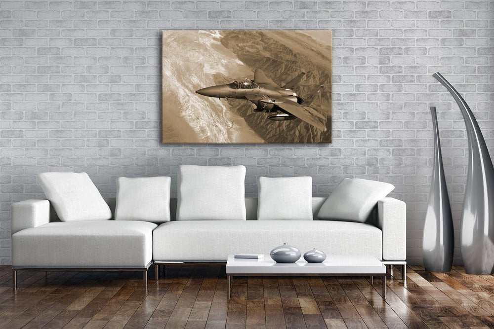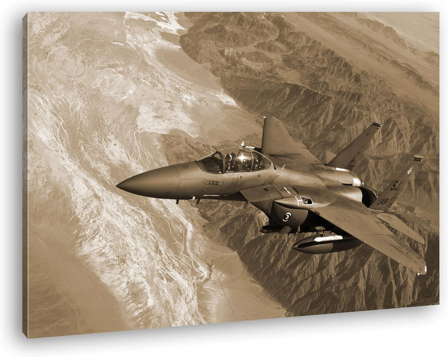 gewaltiger Kampfjet über den Bergen Format: 60x40 Effekt: Sepia als Leinwandbild, Motiv fertig gerah