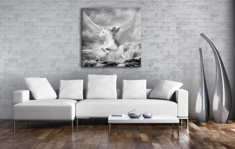 Frau auf dem edlen Pegasus Format: 60x60 Effekt: Schwarz&Weiss als Leinwandbild, Motiv fertig gerahm