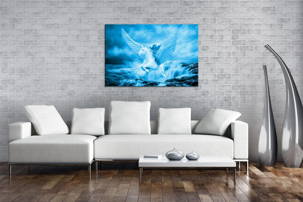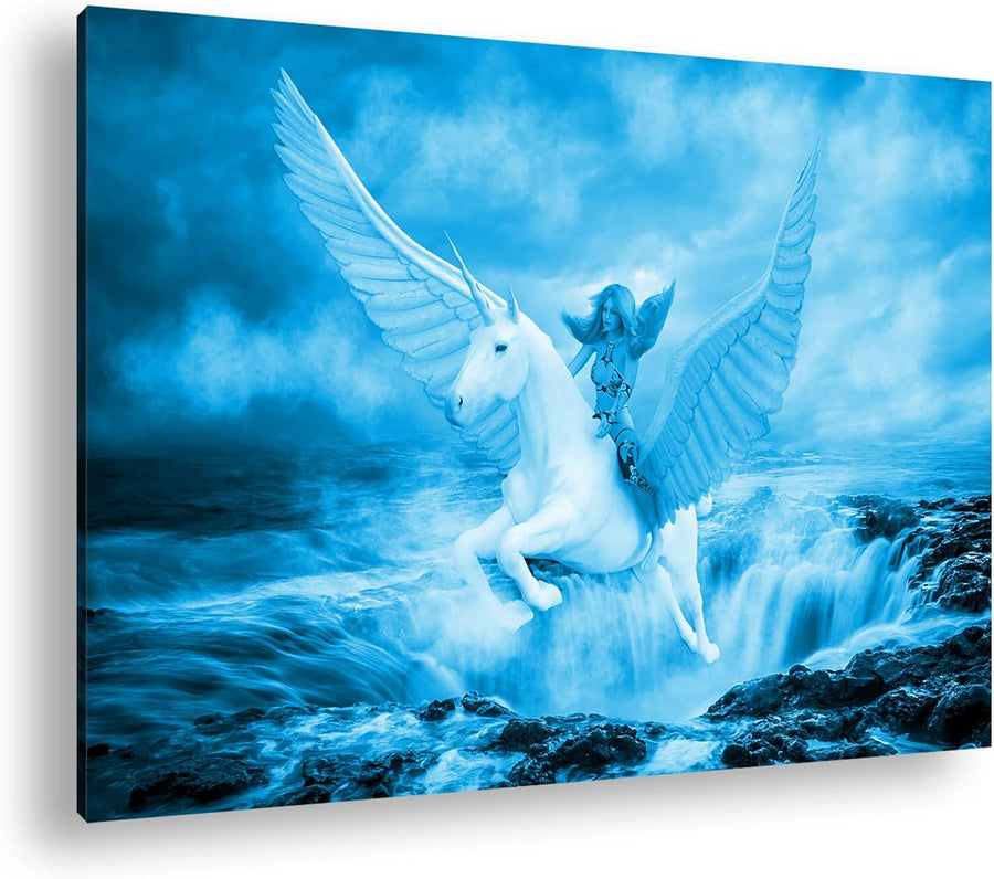 Frau auf dem edlen Pegasus Format: 80x60 Effekt: Monocrome Blau als Leinwand, Motiv fertig gerahmt a
