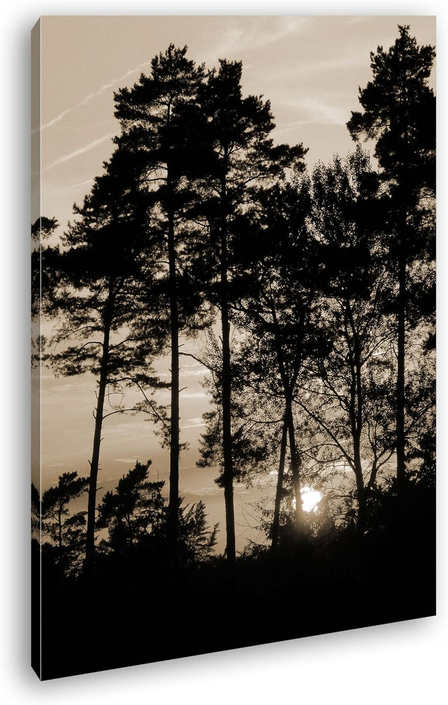 Morgendämmerung zwischen den Bäumen Format: 80x60 Effekt: Sepia als Leinwand, Motiv fertig gerahmt a