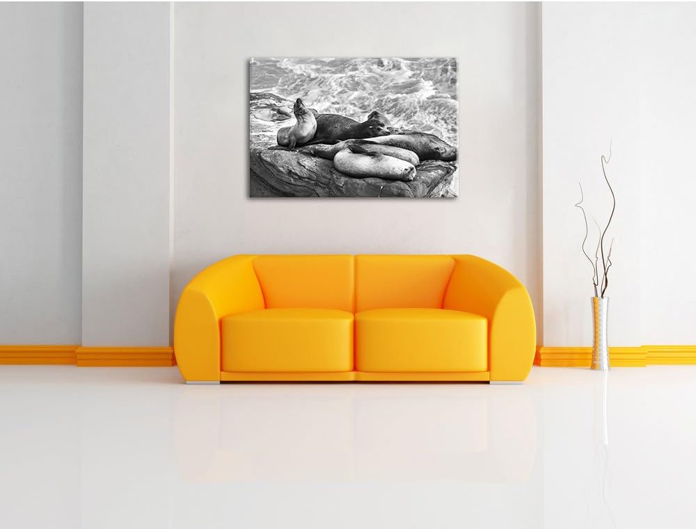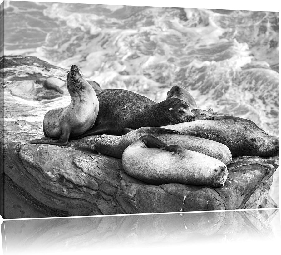 Pixxprint Eine Gruppe von Seelöwen an Einer Bucht Kunst B&W, Format: 100x70 auf Leinwand, XXL riesig