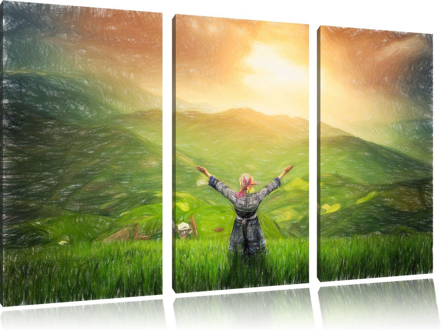 Pixxprint eine Berg Farm in Asien im Sonnenschein Kunst Buntstift Effekt 3-Teiler Leinwandbild 120x8