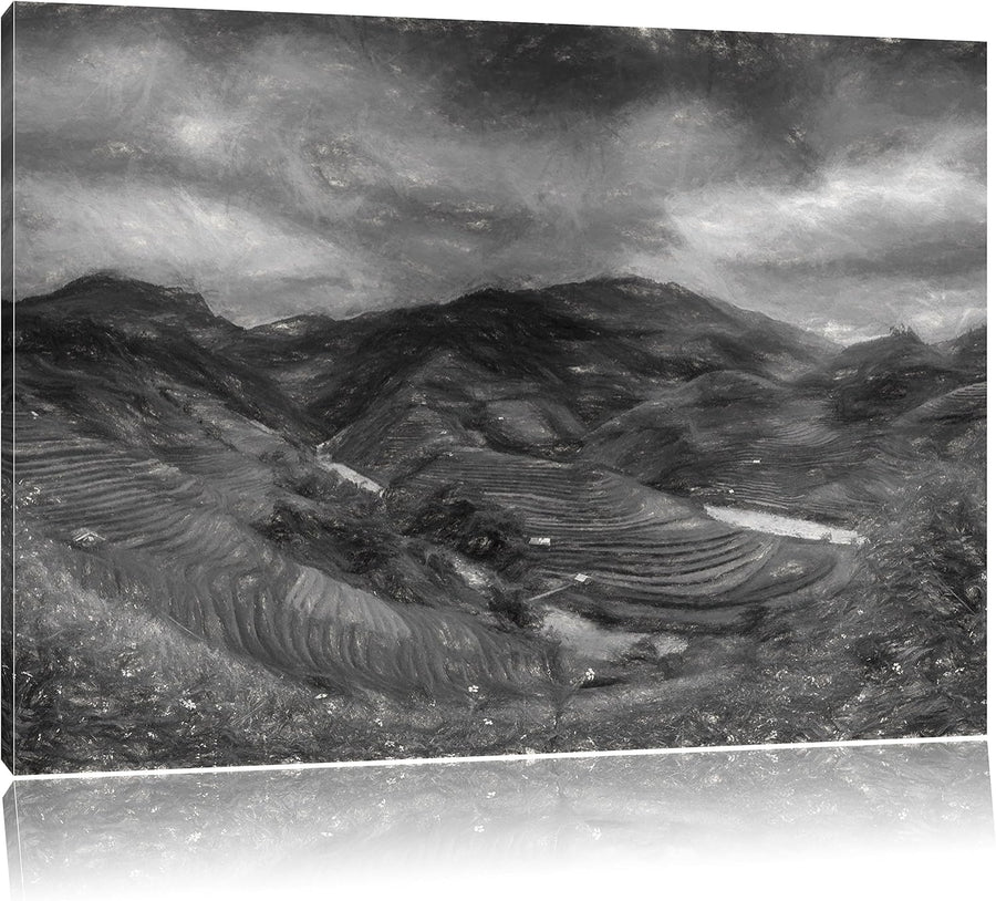 Pixxprint eine Berg Farm in Asien Kunst Kohle Effekt, Format: 100x70 auf Leinwand, XXL riesige Bilde