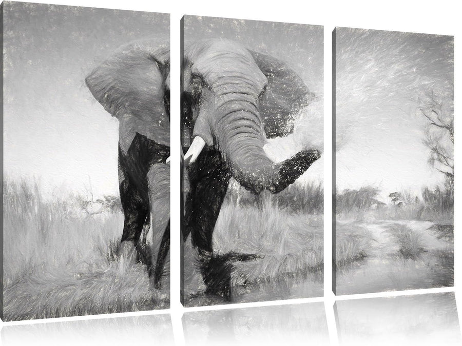 Pixxprint Elefant spritzt mit Wasser als Leinwandbild/Grösse: 3 Teilig (120x80 cm) cm/Wandbild/Kunst