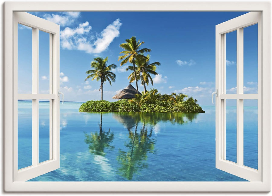 ARTland Leinwandbilder Wandbild Bild auf Leinwand 100x70 cm Fensterblick Fenster Meer Insel Palmen K