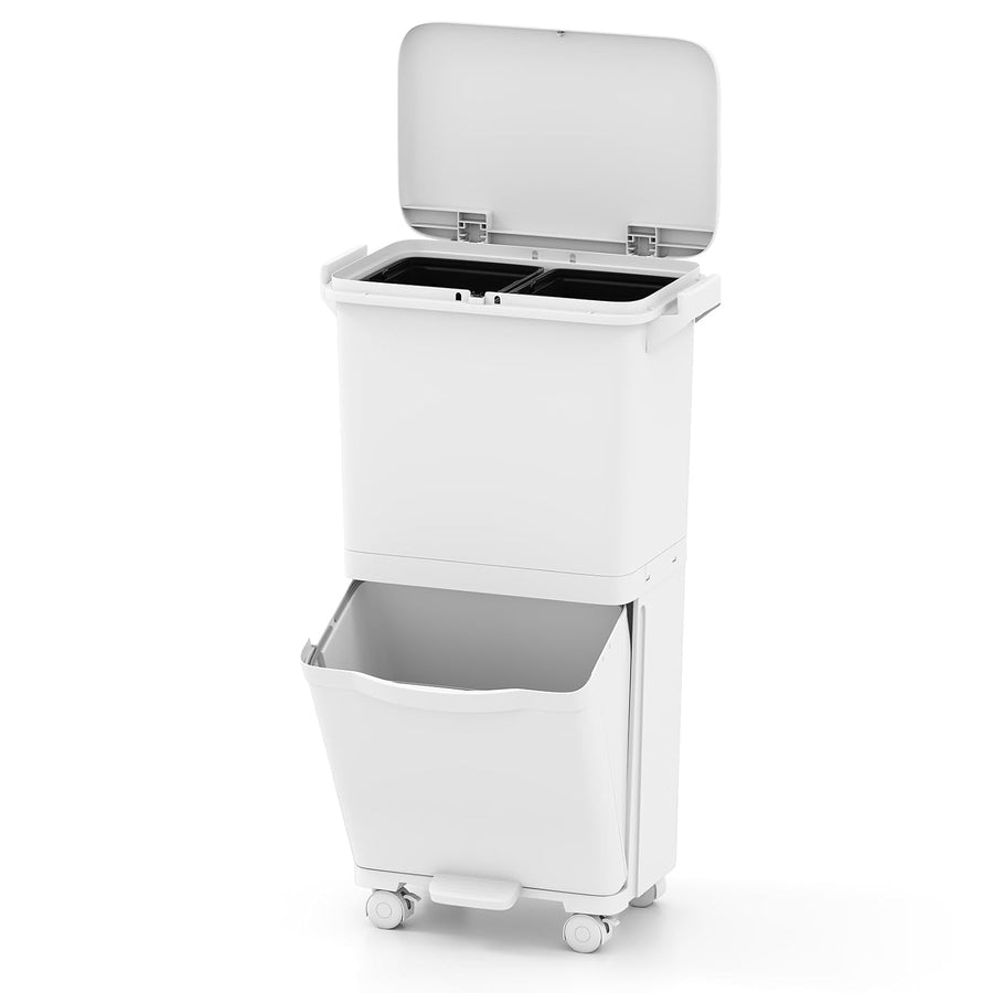 COSTWAY Mülleimer 3 Fächer, 40L Abfalleimer Küche, Tretmülleimer auf Rädern mit neigbarem Behälter &