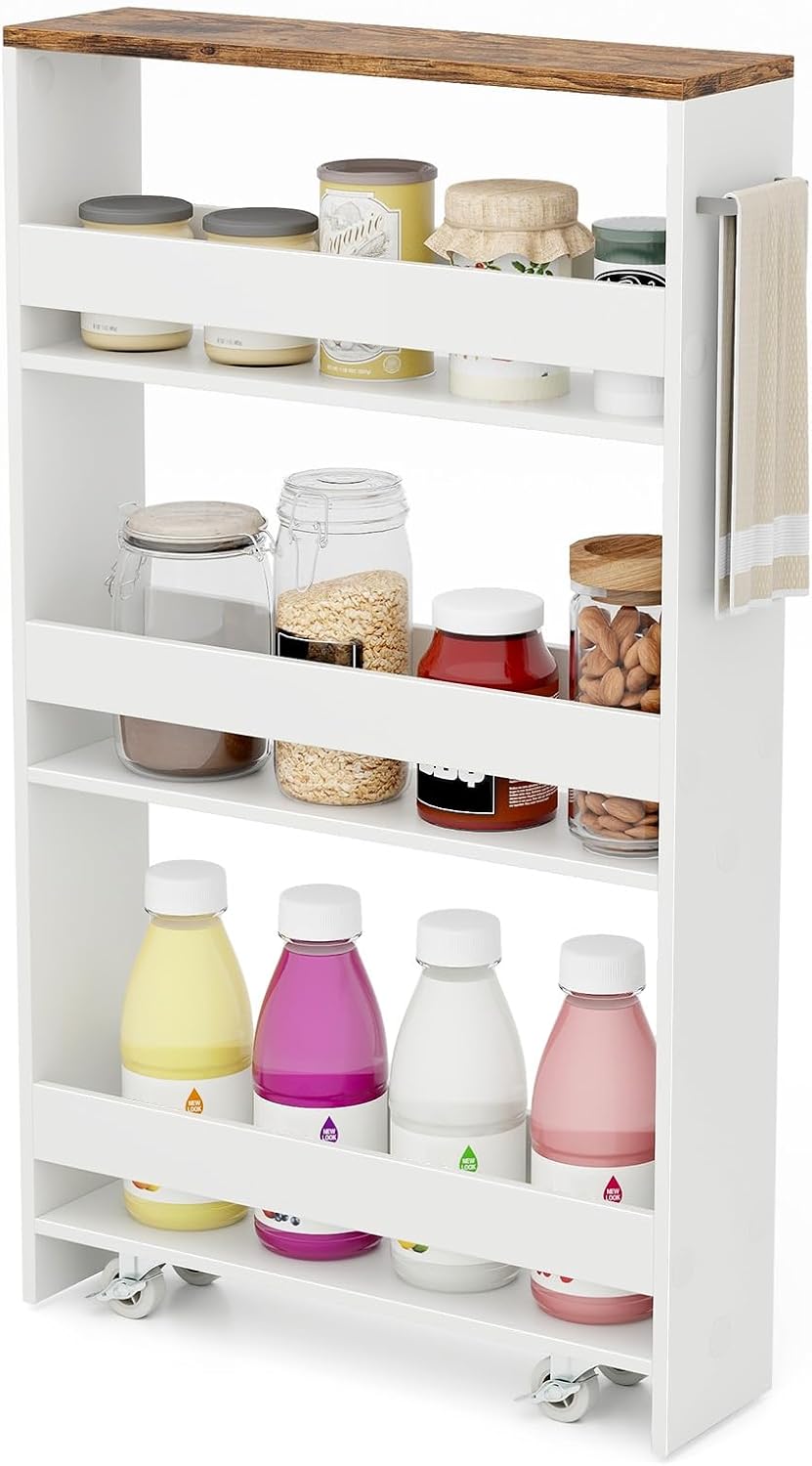 COSTWAY Nischenwagen 13cm breit, 4 Etagen Küchenwagen schmal, Nischenregal auf Rollen, Servierwagen