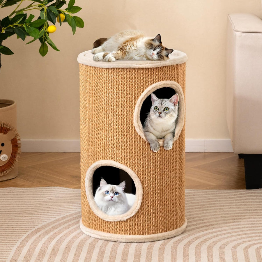 COSTWAY Kratztonne, Ø 36 cm, 59,5 cm hoch, Katzentonne mit Sisal-Kratzbrett, 3 Katzenhöhlen, Plüschb