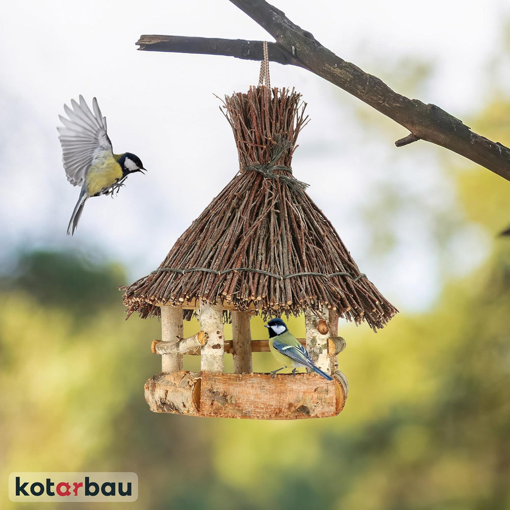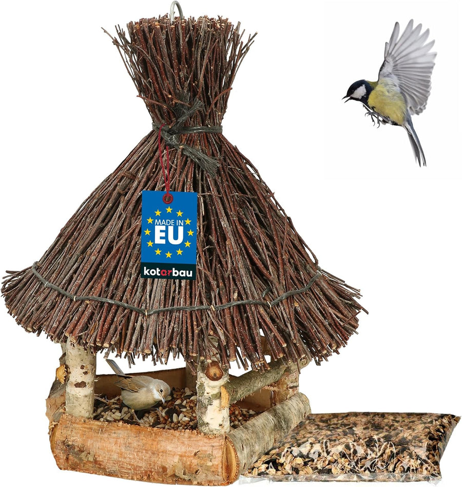 KOTARBAU® Holz-Vogelfutterhaus mit Reet eingedeckt Birke zum Aufhängen + 0,5 kg Futter Gratis