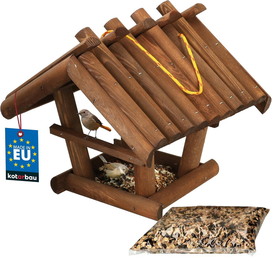 KOTARBAU® Holz Vogelfutterhaus Klein aus Natürlichem Holz Dunkelbraun zum Aufhängen + 0,5 kg Futter