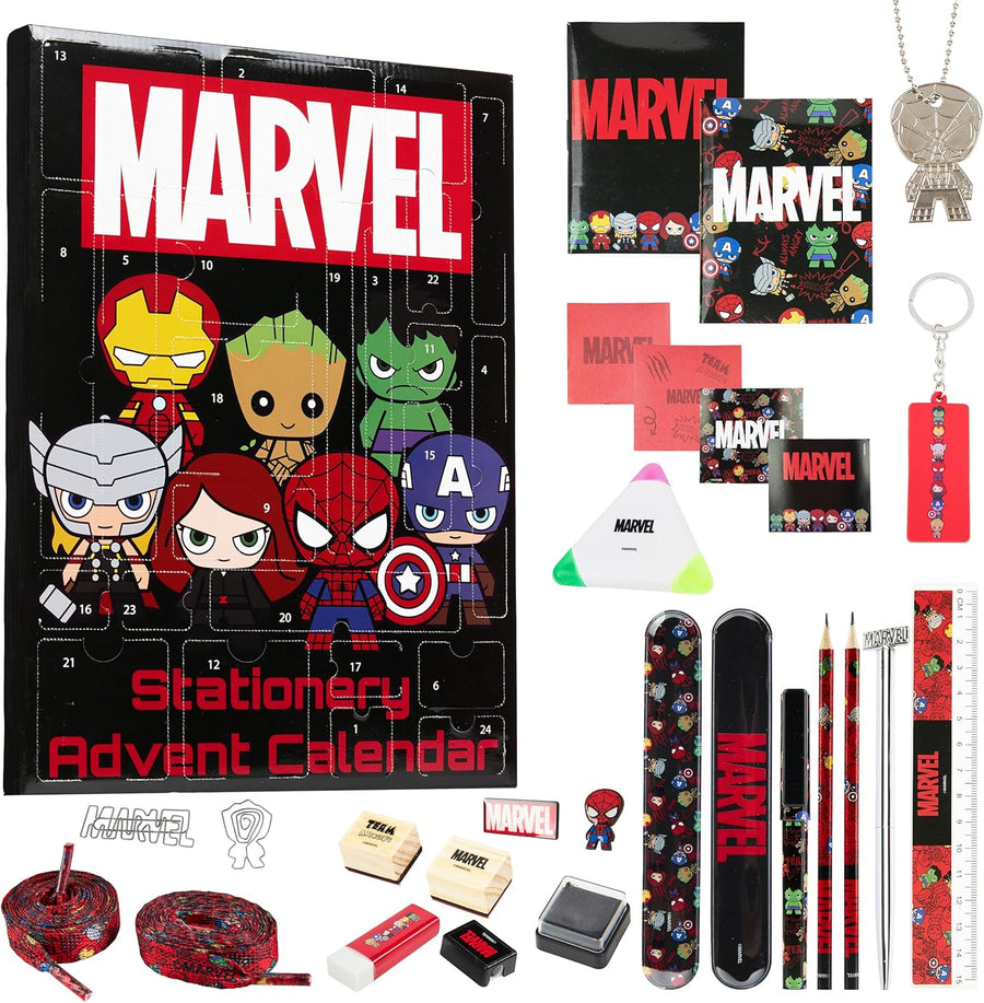 Marvel Adventskalender 2024 mit Schulsachen Schlüsselanhänger Spielzeug für Kinder (Marvel Schwarz),