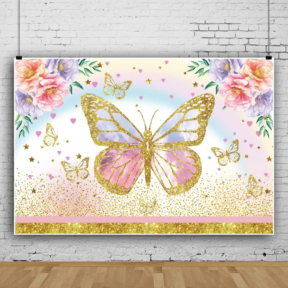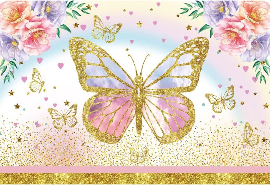 Renaiss 3x2m Schmetterling Thema Kulisse Regenbogen Blumen Goldener Glitzer Fotografie-Hintergrund B