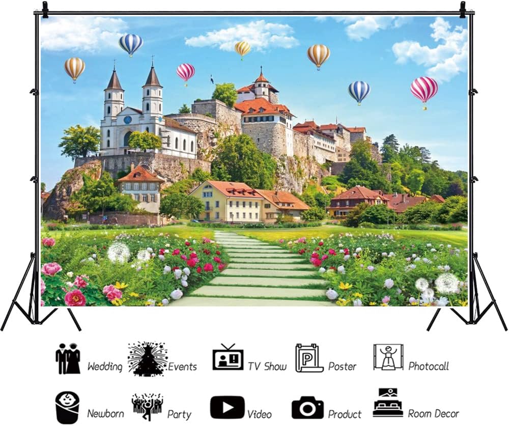 Renaiss 3x2m Schloss Fotografie Kulisse Verträumter Garten Blume Blauer Himmel Heissluftballon Hinte