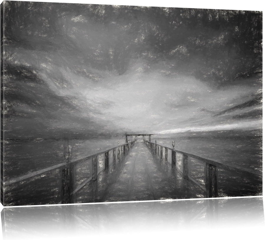 Pixxprint Endloser Steg ins Meer im Sonnenuntergang Kohle Zeichnung Effekt, Format: 100x70 auf Leinw