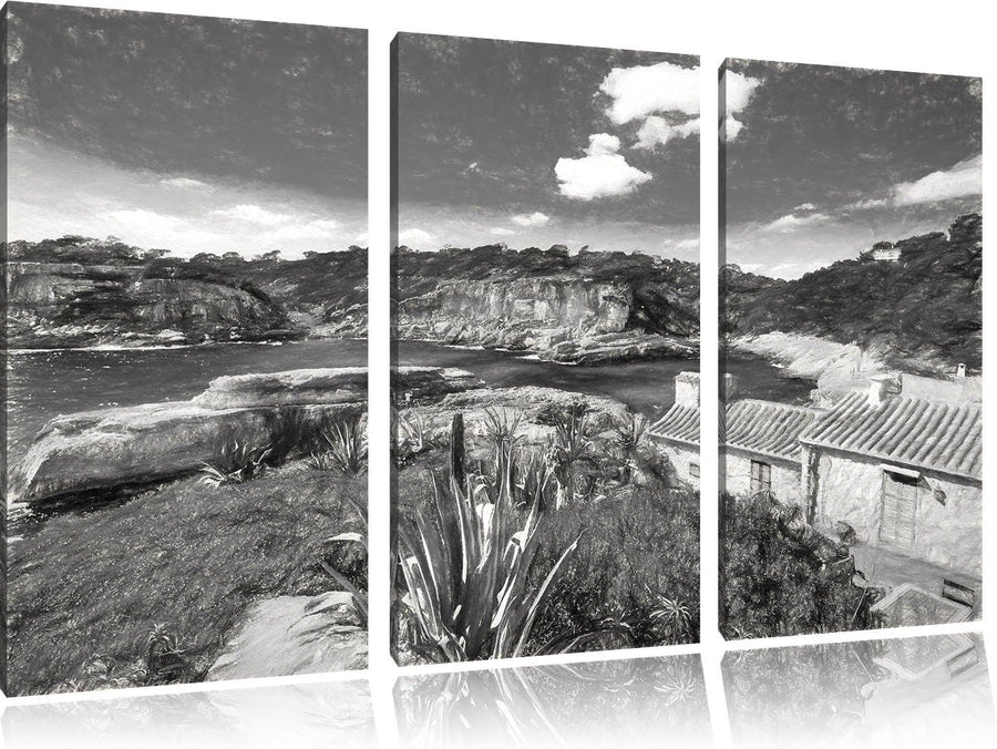 Pixxprint Ferienhaus an der spanischen Küste B&W Detail 3-Teiler Leinwandbild 120x80 Bild auf Leinwa