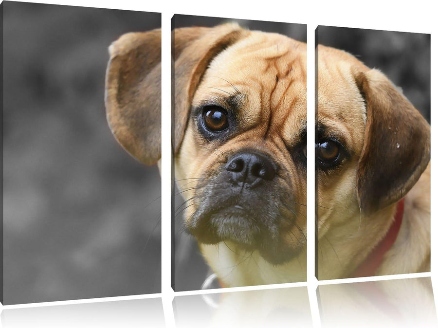 Pixxprint fragend schauender Mops Welpe B&W Detail 3-Teiler Leinwandbild 120x80 Bild auf Leinwand