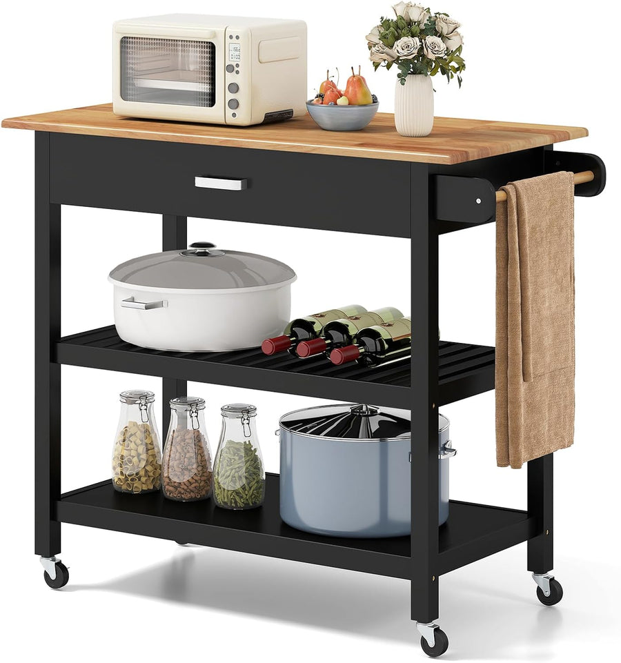 COSTWAY Küchenwagen, Mobile Kücheninsel mit Arbeitsplatte, 3-stöckiger Küchenrollwagen mit 2 offenen