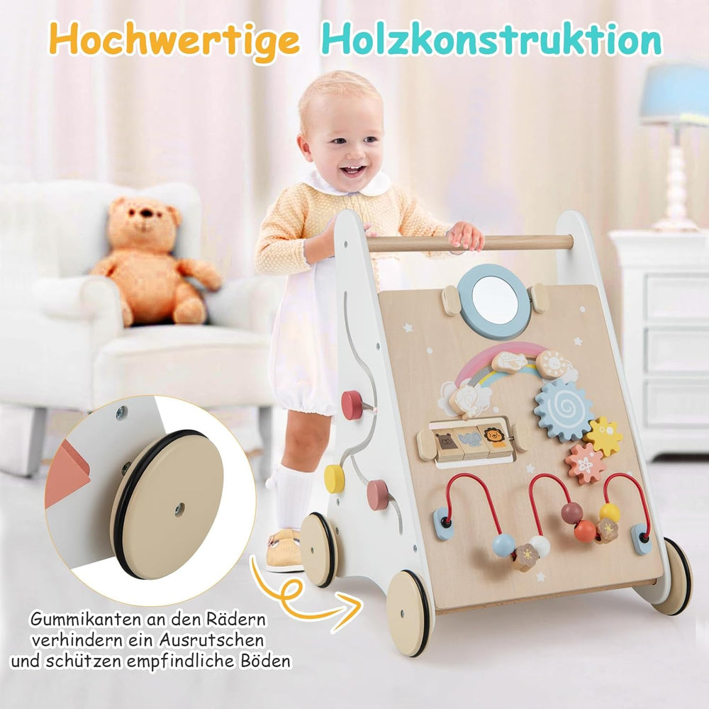 COSTWAY Lauflernhilfe aus Holz, 7 in 1 Lauflernwagen mit Spielbrett, Spiegel & Bauklötzen, Laufwagen