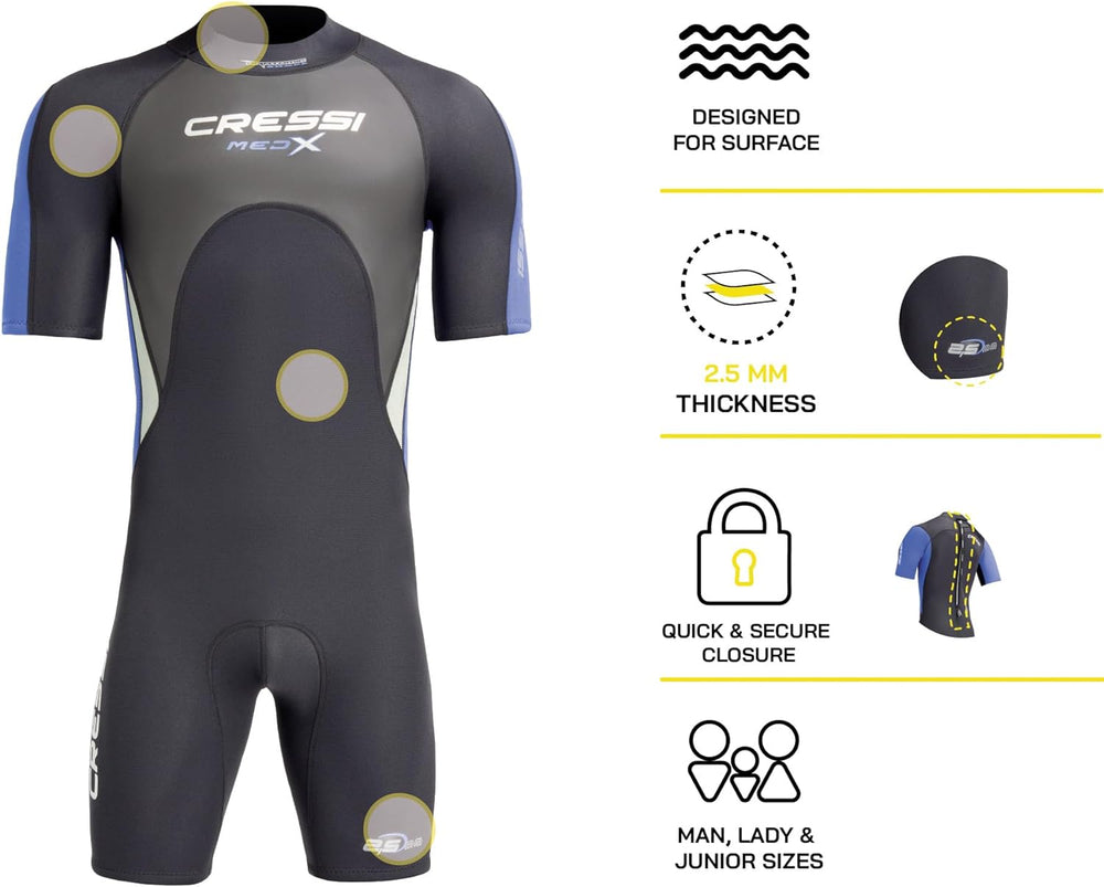 Cressi Med X Men's - Shorty Herren Neoprenanzug Premium Neopren 2.5 mm XS/1 Schwarz/Blau/Silber, XS/