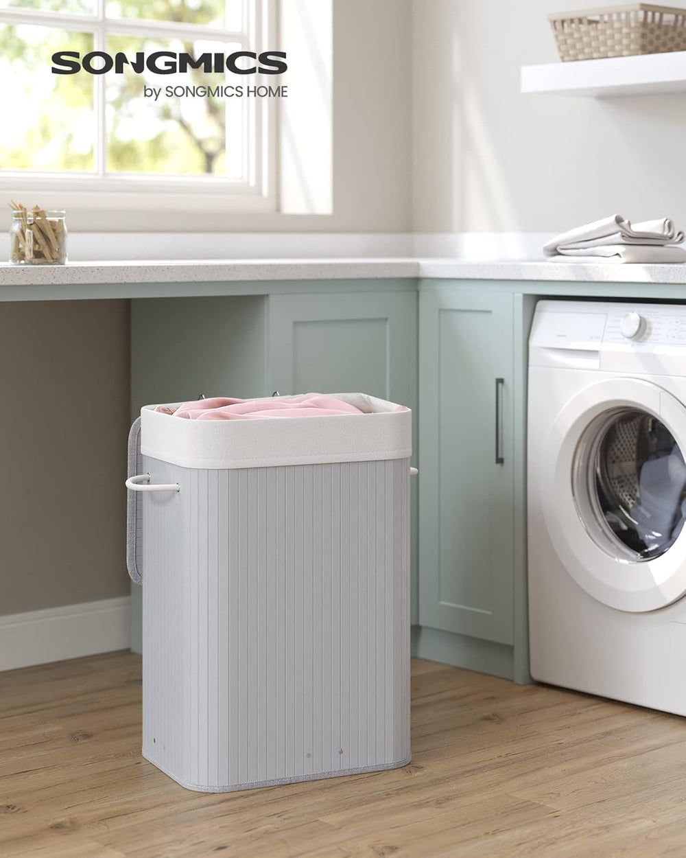 SONGMICS Wäschekorb mit Deckel, Wäschekorb aus Bambus, 2 Sortierfächer, abnehmbarer Beutel, Griffe a