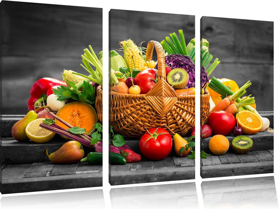 Pixxprint Frisches Obst und Gemüse im Korb als Leinwandbild 3 teilig/Grösse: 3 Teilig (120x80) / Wan
