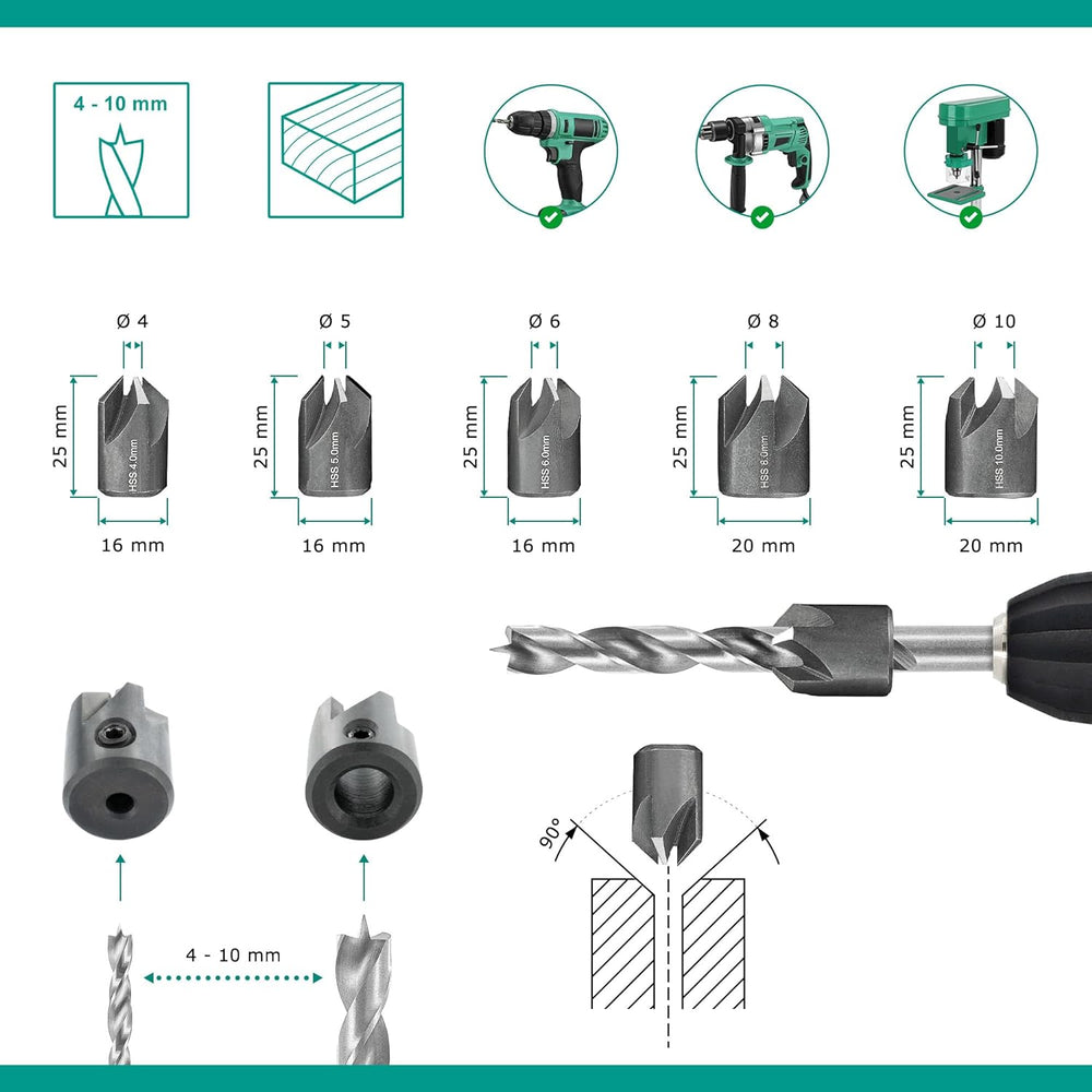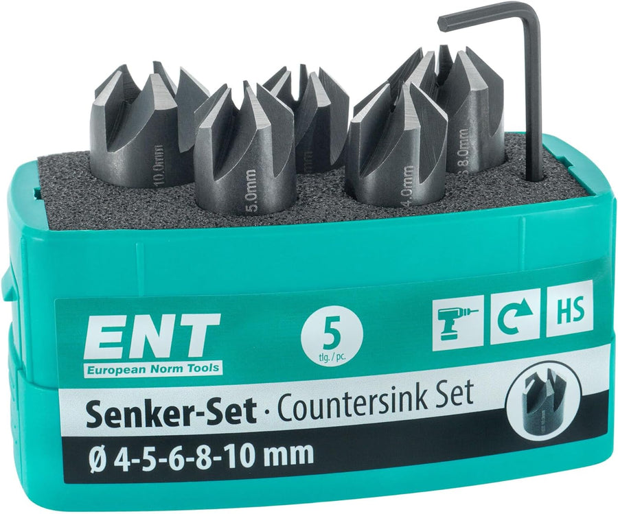 ENT 26516 5-tlg Aufsteckversenker-Set HSS, Durchmesser (d) 4, 5, 6, 8 und 10 mm, e 90°, Rechts 5-tlg