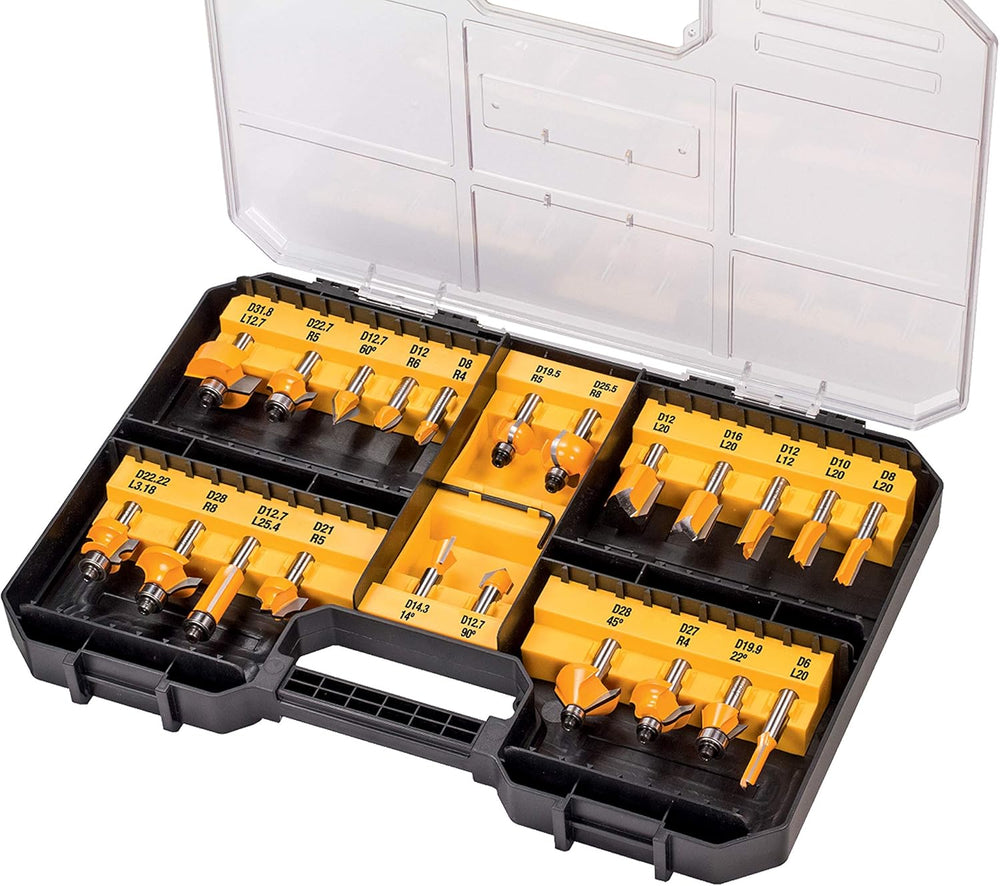 Dewalt Fräser-Set 22 tlg. (Nutfräser, Zinkenfräser, Hohlkehlfräser, in Aufbewahrungsbox mit Klarsich