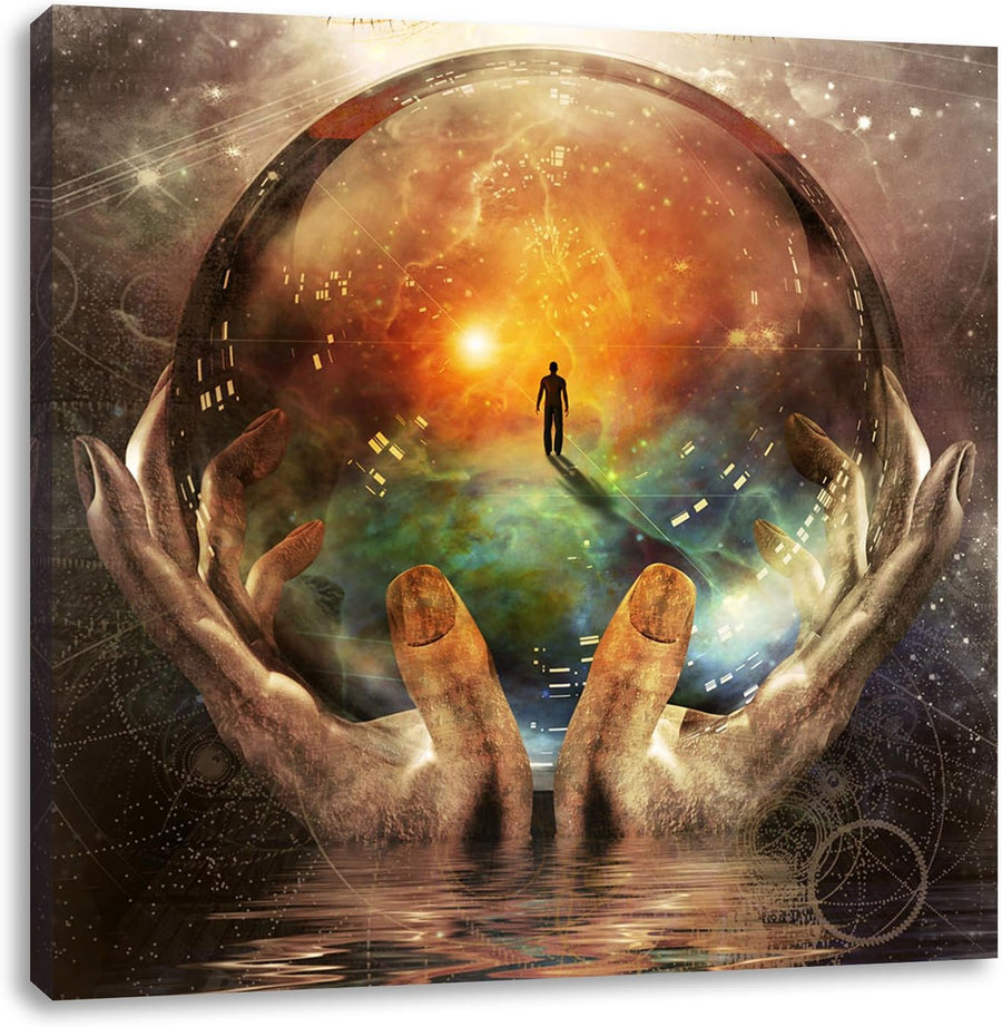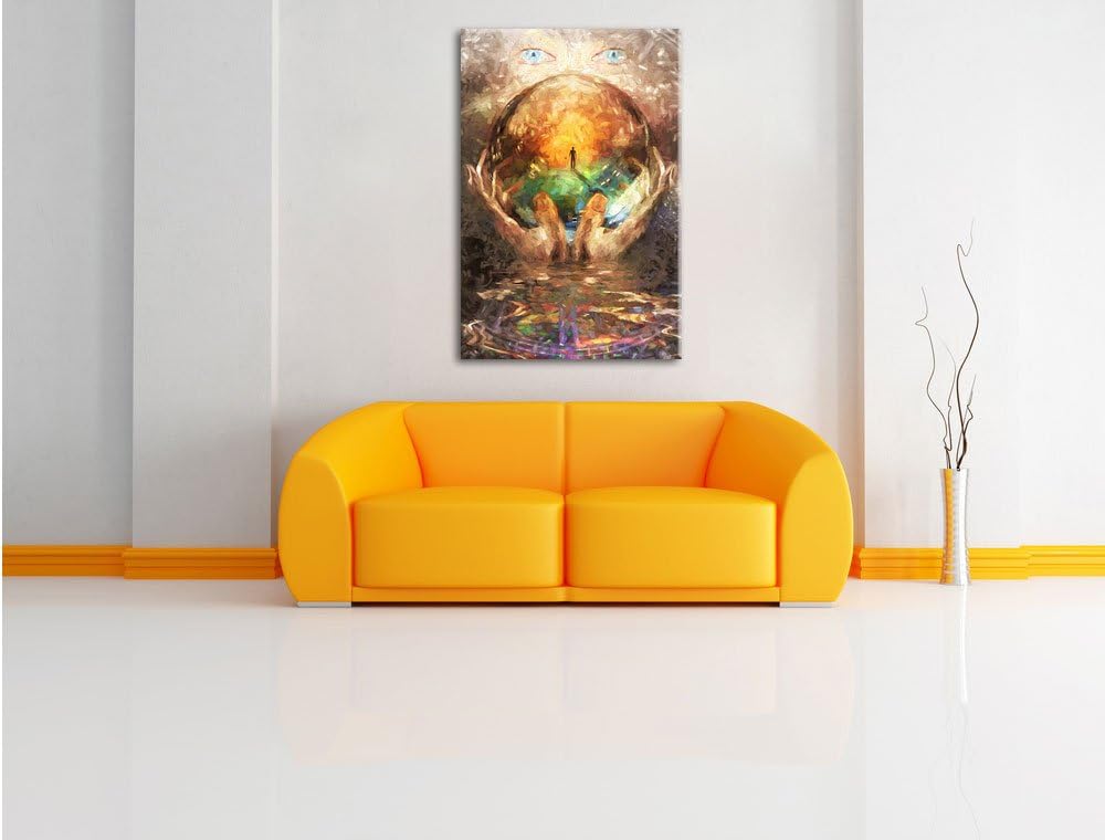 Pixxprint Glaskugel in der Hand mit abstrakten Hintergrund, Format: 100x70 auf Leinwand, 100x70