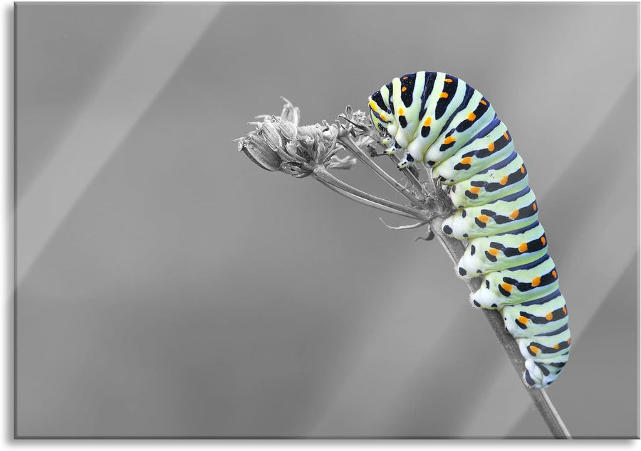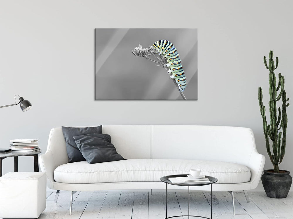 Pixxprint Glasbild | Wandbild aus Echtglas | Grüne Raupe auf Ast Tiere | 60x40 cm | inkl. Aufhängung