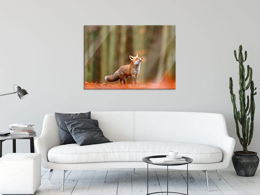 Pixxprint Glasbild | Wandbild aus Echtglas | Neugieriger Fuchs im Herbstwald | 80x60 cm | inkl. Aufh