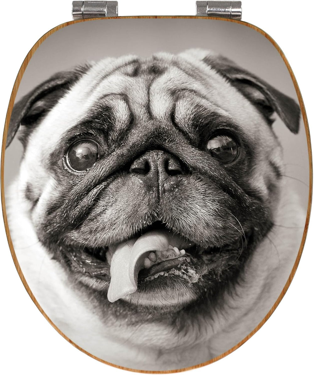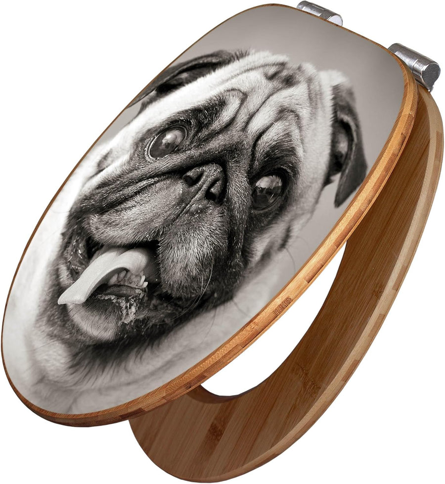 banjado® Design WC Sitz Bambus Absenkautomatik mit Motiv Mops Porträt/Toilettendeckel mit Absenkauto