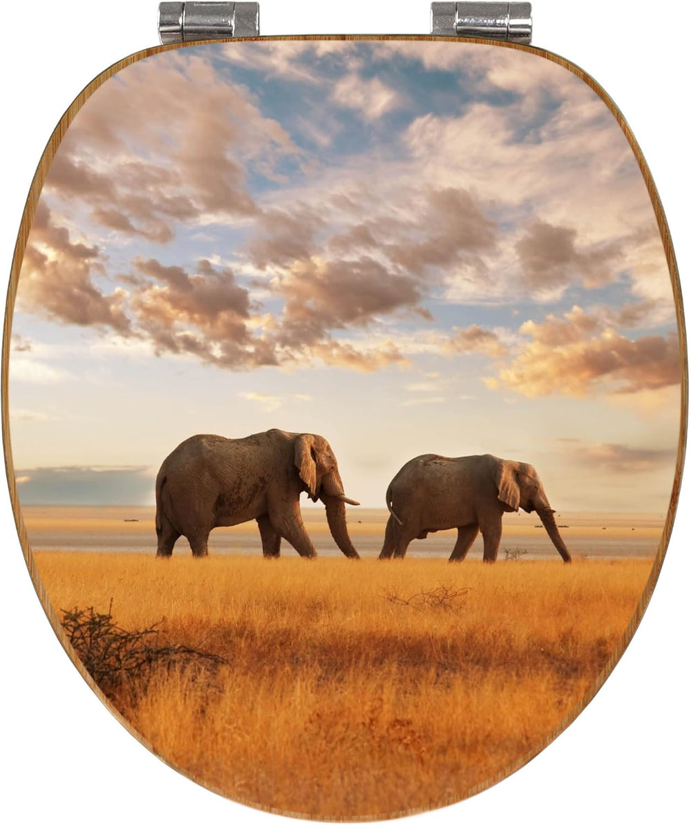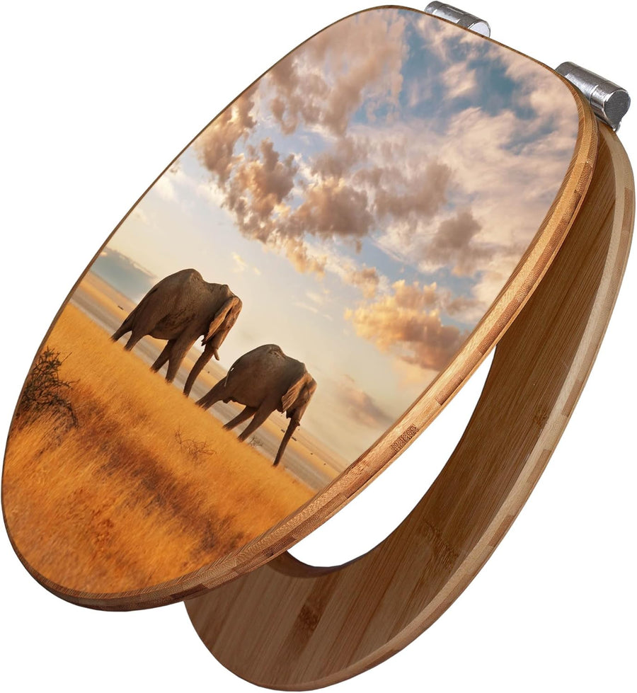 banjado® Design WC Sitz Bambus Absenkautomatik mit Motiv Elefanten/Toilettendeckel mit Absenkautomat