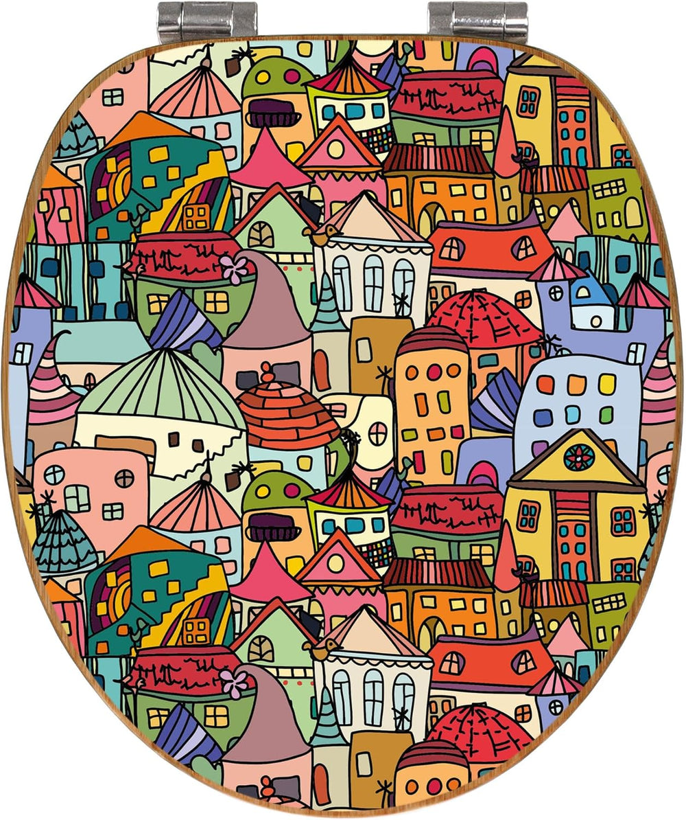 banjado® Design WC Sitz Bambus Absenkautomatik mit Motiv Funky Town/Toilettendeckel mit Absenkautoma