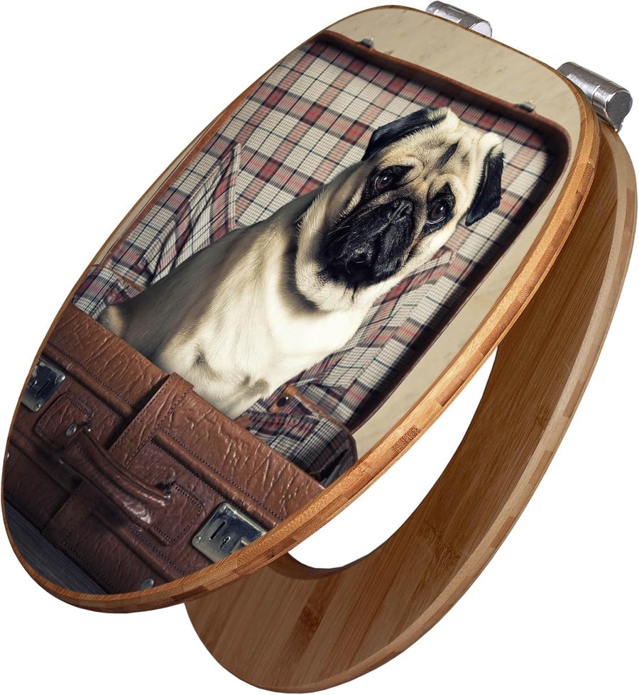 banjado® Design WC Sitz Bambus Absenkautomatik mit Motiv Mops im Koffer/Toilettendeckel mit Absenkau