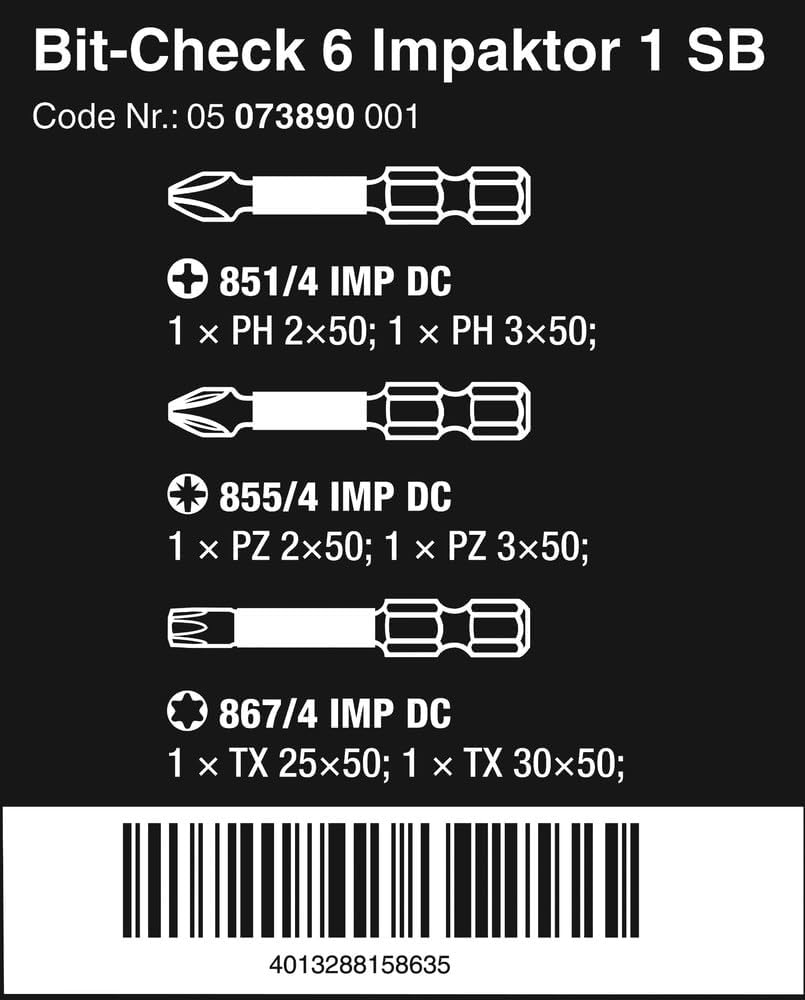 Wera Bit-Sortiment, Bit-Check 6 Impaktor 1 SB, 6-teilig, Wera 05073890001, Bit-Check 6 Impaktor 1 SB