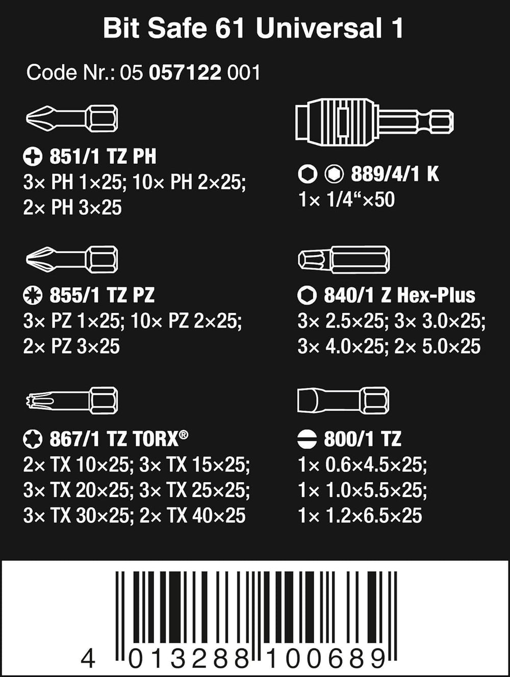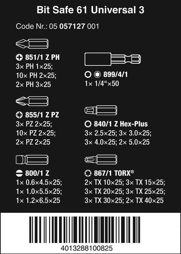 Wera Bit-Sortiment, Bit-Safe 61 Universal 3, 60-teilig, 05057127001 Single