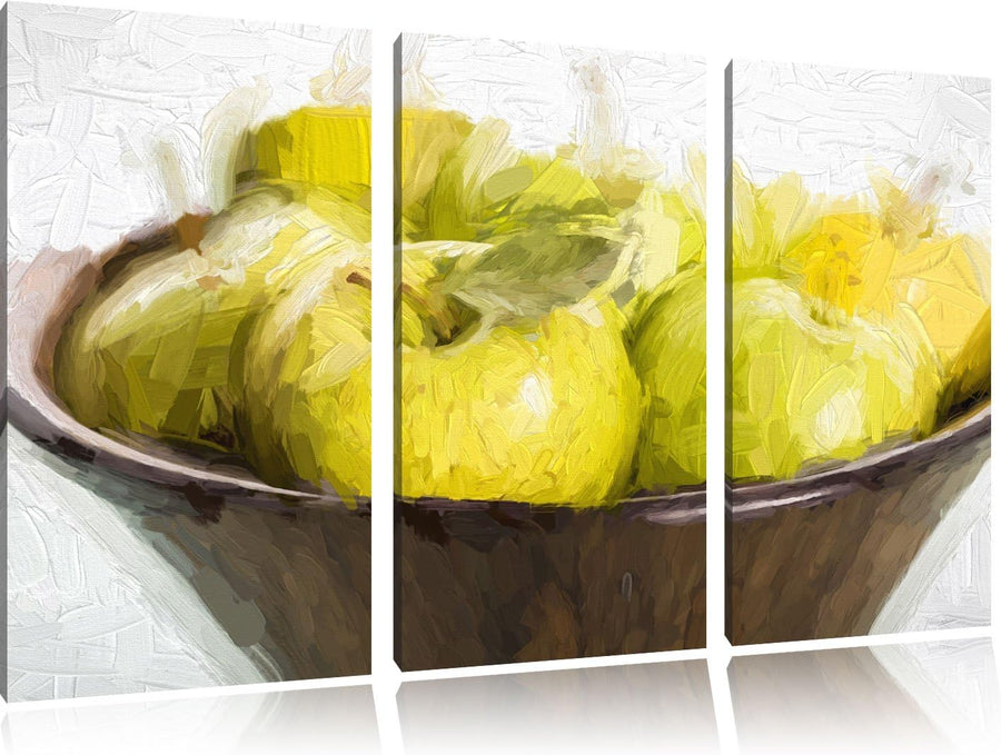Pixxprint grünen Äpfel in Holzschale Pinsel Effekt 3-Teiler Leinwandbild 120x80 Bild auf Leinwand