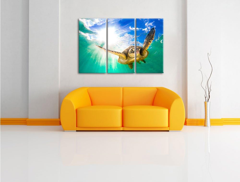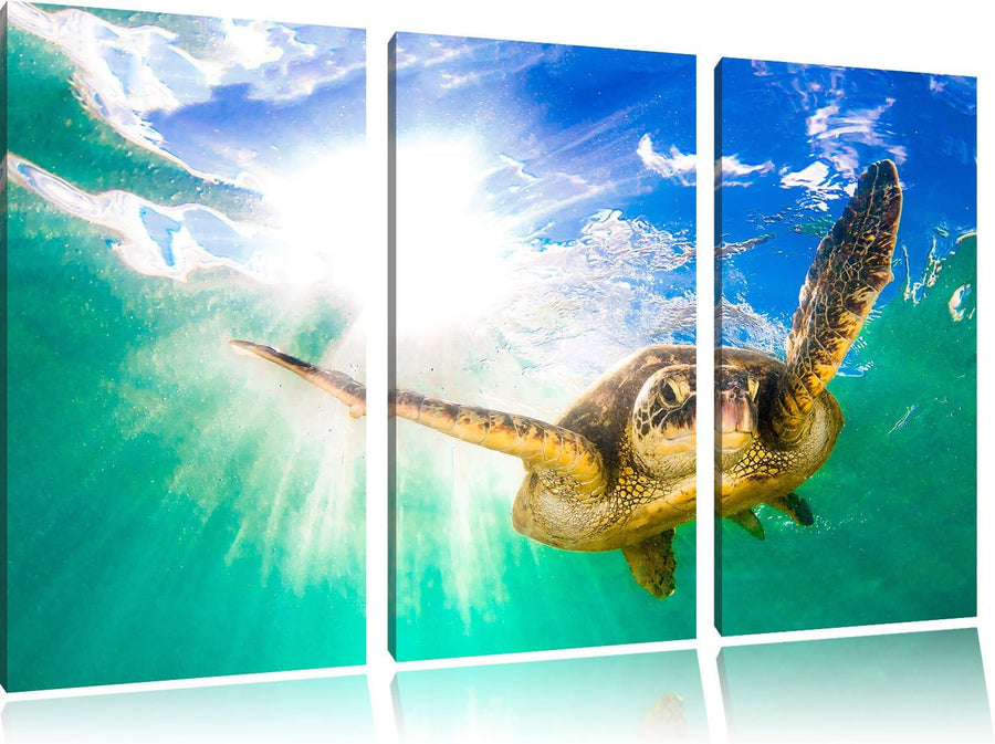 Pixxprint Grüne Meeresschildkröte als Leinwandbild | Grösse: 3 Teilig (120x80) | Wandbild| Kunstdruc