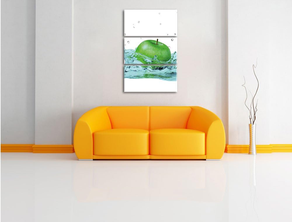 Pixxprint Grüner Apfel fällt in Wasser als Leinwandbild/Grösse: 3 Teilig (120x80) cm/Wandbild/Kunstd