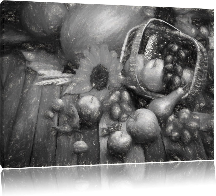 Pixxprint Herbstlicher Obstkorb Kohle Zeichnung Effekt, Format: 100x70 auf Leinwand, XXL riesige Bil