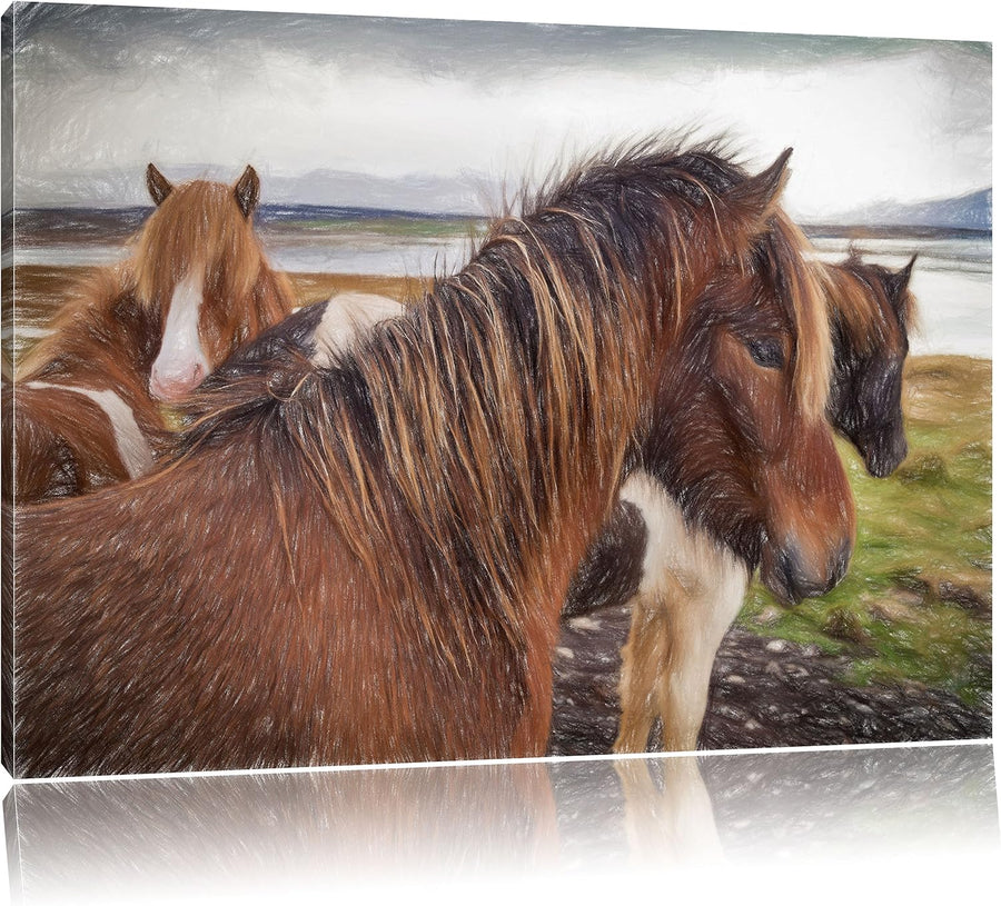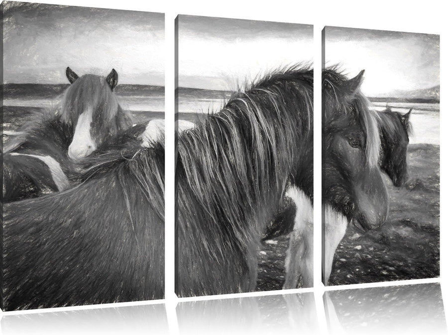 Pixxprint Herde aus schönen Wildpferden Kunst Buntstift Effekt 3-Teiler Leinwandbild 120x80 Bild auf