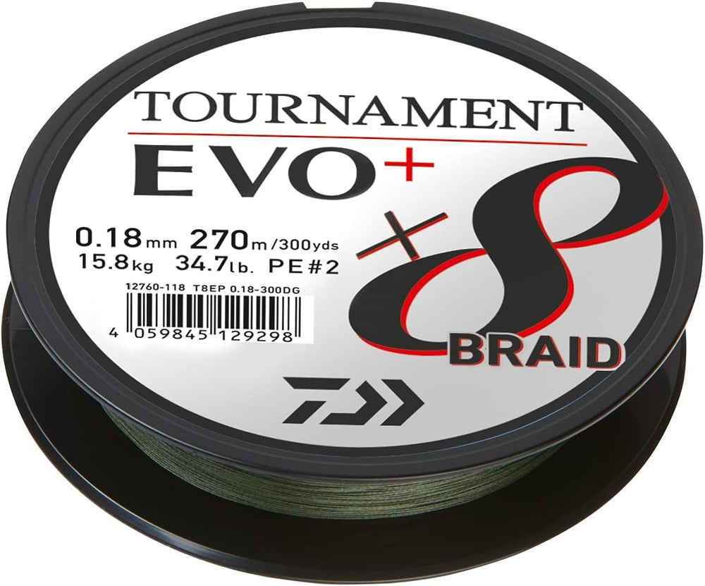 Daiwa Tournament x8 Braid EVO+, 900m, Dunkelgrün, Geflochtene Angelschnur 900m/0.14mm, 900m/0.14mm
