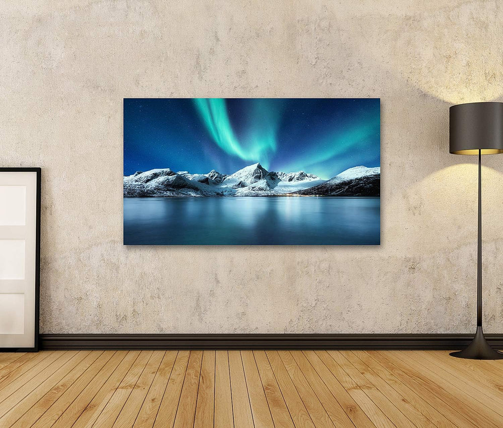 islandburner Bild auf Leinwand Aurora Borealis Lofoten Inseln Norwegen Nordlichter Berge Reflexion W