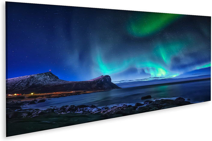 islandburner Bild auf Leinwand Aurora Borealis Über Fischerdorf Beleuchtung Küstenlinie Winter Lofot